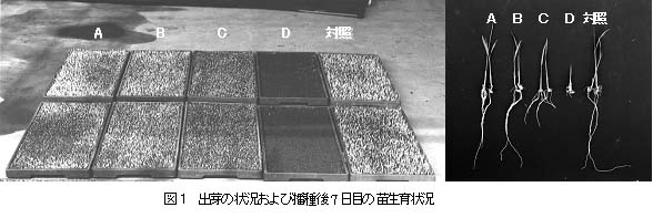 - 育苗再現試験の結果、30℃×3日間加温後の出芽は、障害の発生した培土で著しい不良となった。出芽作業後、ビニルハウス内に置床管理したところ、他区より遅れてかなりの出芽数が認められ、出芽不良の原因は籾の枯死によるものではなく出芽速度の遅延と思われた。播種後7日目(ビニルハウス置床後4日目)の苗は、障害発生培土で草丈、葉齢が対照培土等に比べ著しく小さく、最長根長も1cm以下とほとんど伸長していなかった(図1)。