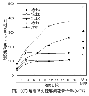 - 育苗培土の硫酸態硫黄含量は、障害が認められた培土では30℃培養で直線的に増加し、培養18日で過酸化水素処理による硫酸態硫黄量の60~85%の量が認められた(図2)。