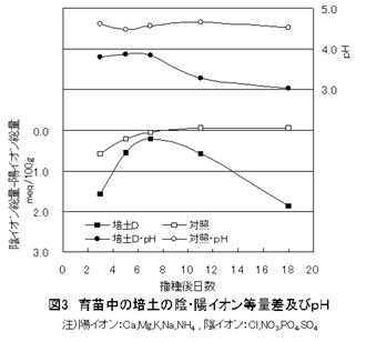 - 育苗中の培土の水浸出液中のイオンバランスについて、障害発生培土と対照培土で比較すると、対照培土は陽イオンと陰イオンのバランスがとれているのに対し、障害発生培土では播種後11日以降、陰イオンの方が多くなり、この増加分はpHの低下と対応していた(図3)。