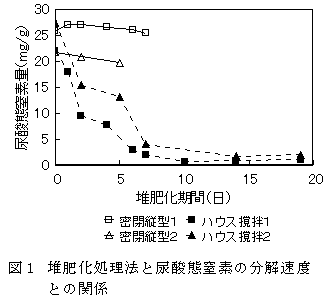 - 堆肥化段階での尿酸態窒素の減少速度は、ハウス撹拌発酵方式と密閉縦型方式の間に大きな差があり、密閉縦型方式での尿酸態窒素の分解速度はハウス撹拌方式の約1/10に抑制される。(図1)