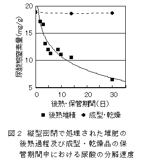 - 縦型密閉で処理された堆肥は、堆肥水分を30%と乾燥気味の条件で堆積保管した場合、2週間で尿酸態窒素は半減する。一方、縦型密閉から取り出された直後に水分15%以下にまで温風乾燥させた製品ではほとんど変化は認められない。(図2)