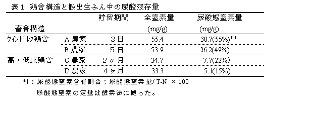 - 生ふん中の全窒素量及び尿酸態窒素量は、鶏舎での貯留期間により大きく影響を受ける。ウインドレス鶏舎では貯留期間が数日程度と短く、回収間隔が一定であるため、全窒素及び尿酸態窒素量の高い、安定した生ふんが供給されることになる。一方、低・高床鶏舎では貯留期間が数ヶ月と長く、尿酸態窒素が分解し、NH3ガスとして揮散するため、搬出時点で尿酸態窒素の60~70%が減少する。このため、成分安定を図るには、鶏舎からの生ふんの搬出を素早く、一定間隔で行うことが重要である。(表1)