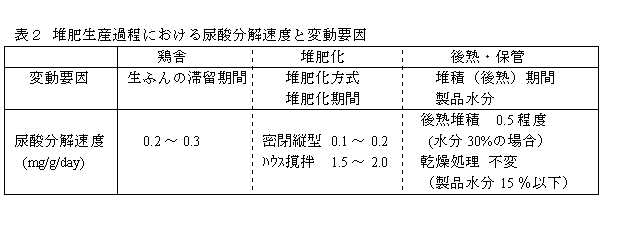 - 鶏ふん堆肥の品質(窒素肥効)安定、及び均質堆肥生産は、表2に示した(1)鶏舎からのふん搬出段階、(2)堆肥化段階、(3)後熟保管段階の各段階での尿酸の分解速度を考慮し、変動要因をいかに制御するかにかかっている。なお、各段階での1日乾物1g当たりの尿酸分解量は、(1)では0.2~0.3mg、(2)では密閉縦型方式の場合0.1~0.2mg、ハウス乾燥方式の場合で1.5~2.0mg、(3)の後熟堆積では0.5mg程度である。