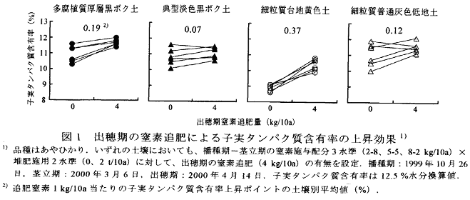 出穂期窒素追肥による小麦子実タンパク質含有率の上昇効果には土壌間差が認められる。追肥窒素1 kg/10a当たりの上昇量(%)は、典型淡色黒ボク土:0.07、細粒質普通灰色低地土:0.12、多腐植質厚層黒ボク土:0.19、細粒質台地黄色土:0.37である。上昇量の土壌間差は、出穂期の小麦地上部窒素含有量の影響を受けている。