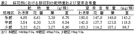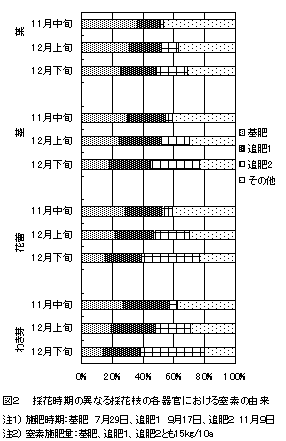 カーネーションは生育・採花期間が長いため、土壌化学性を適正に保つように施肥管理を行うには、窒素の吸収特性に基づいた施肥法が求められる。そこで、トレーサー15Nを用いて窒素の施肥時期ごとの利用率と各器官における分布を明らかにする。