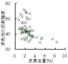 図1 作土の炭素含量とランドサットTMデータの赤色光の反射強度との関係