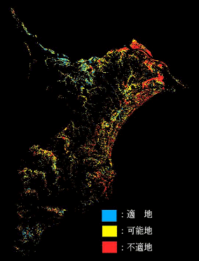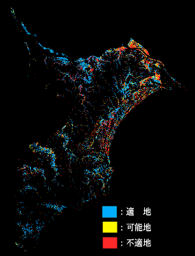- 乾田直播の適地は印旛沼・手賀沼周囲と県南部に多く、利根川下流域と九十九里低地の多くの水田は不適地である(図2)。湛水土壌中直播では多くの水田が適地であるが、利根川下流域と九十九里低地の一部と有機質土壌の水田が不適地である(図3)。湛水散播では、有機質土壌の水田のみが不適地である。この図は画像データとなっているので、地形図などの情報と重ね合わせて利用できる。