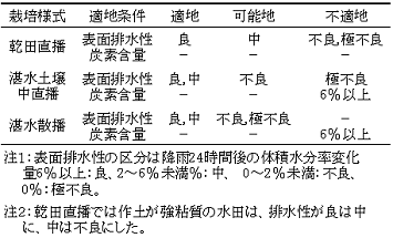 - 乾田直播の適地、可能地、不適地は、それぞれ表面排水性が良、中、不良・極不良の水田とするが、作土が強粘質の場合は降雨直後の作業性が悪いので、排水性良は中に、中は不良とする(表1)。湛水土壌中直播の適地、可能地、不適地は、それぞれ排水性が良・中、不良、極不良で、作土が有機質土壌の水田は不適地とする。湛水散播の適地、可能地は、それぞれ排水性が良・中、不良・極不良で、不適地は有機質土壌とする。
