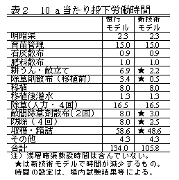 - 10a当たり投下労働時間は慣行モデル約134時間に対し、新技術モデルが約106時間で、約28時間少ない(表2)。収穫から箱詰の10a当たり作業時間は、降雨による作業性低下を見込み、新技術モデル約49時間、慣行モデル約59時間である。