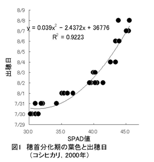 地力差等により圃場内に生ずる部分的な生育差のうち,水稲の出穂日較差は分げつ最盛期以降の葉色と密接な関連があり、移植栽培の「コシヒカリ」では穂首分化期頃の葉色値(SPAD値)を用いることにより予測することができる。