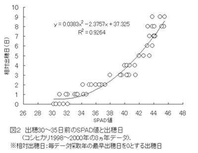 - 移植栽培した「コシヒカリ」を用いて、1998年~2000年の3か年に施肥量等を変えて人為的な圃場内生育較差を作出し、出穂前30~35日のSPAD値と出穂日の関係を調査した。各年次の最早出穂日を0とする相対出穂日とSPAD値との関係から、次の二次式で示される出穂日較差の予測式を得た(図2)。