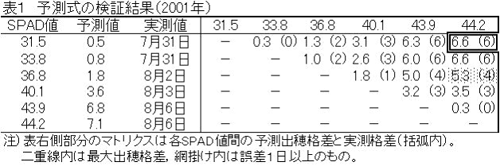 - 2001年に「コシヒカリ」圃場で人為的な生育較差を作出し予測式の有効性を試した。出穂前35日のSPAD値を計測し、予測式に代入して得られた予想最大出穂日較差は6.6日であり、実測出穂日の較差6日とほぼ同程度であった(表1)。各SPAD値から得られる部分較差の予測値もほとんどが実測値と1日以内の誤差であった(表1)。