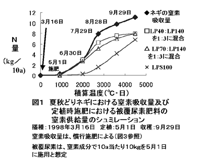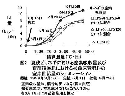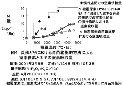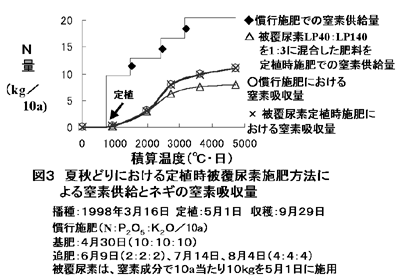 窒素吸収パターンに合った被覆尿素肥料の育苗箱施用や本圃の条施用で、9、10月どりネギの全量基肥栽培が可能である。本技術により、慣行栽培に比較して、育苗箱施用で約70%、条施用で50%の窒素成分が削減でき、減肥栽培が可能となる。