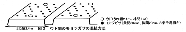 山地の林下に自生するモミジガサは強い日射を嫌うため、圃場では遮光施設なしでは栽培が困難である。そこで、圃場の有効活用のため、茎葉が茂り遮光効果が期待できる山菜(ウド、タラノキ)と組み合わせた栽培方法の可能性を検討する。