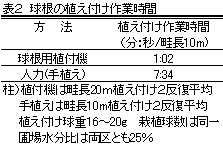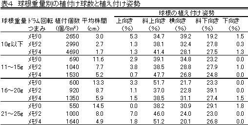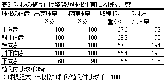 チューリップ等で用いられている球根植付機を改良した球根用植付機は、従来の作業能率の7倍である。球根肥大が劣る下向き植付け率は2%未満と、実用の範囲内である。