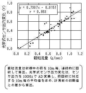 圃場内あるいは圃場間の収量のばらつきを把握することは、次年度の施肥や管理の方針を決定する重要な情報になると考えられる。収量を計測するために様々な手法が試みられているが、光学式センサは粉塵の影響を受けやすい、重量式センサは振動の影響を受けやすい、などの問題があり、小さい面積毎の収量計測を行うには精度が不充分である。そこで、自脱コンバインによる収量計測システム確立のために、両センサの欠点を補ったコンバインタンクへの流入穀粒量の計測方法を開発する。