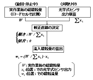 自脱コンバインの収量モニタとしての穀粒流入量計測装置および計測方法である。連続的な穀粒流量計測に光学式センサを使用し、間欠的な積算穀粒流入量計測に重量式センサを使用する。両方のセンサを併用することで、計測精度が安定する。