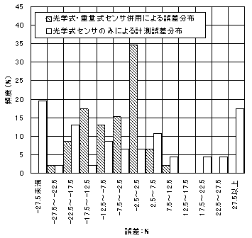 図4 光学式センサ単独と光学式・重量式センサ併用による収量計測誤差分布の比較