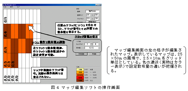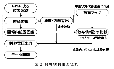 GPSから得られる位置情報に基づき、種子、粒状肥料・農薬の散布量を、あらかじめ作成した散布マップに従い変化させる粒状物散布機の制御システムである。作業速度に連動した制御も可能である。