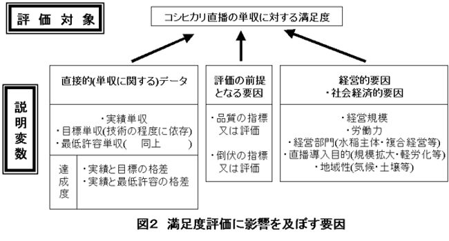 新技術がより普及していくためには、現場のニーズや要求している水準を把握した上で開発・確立していく必要がある。ここでは、コシヒカリ直播を実施している生産者に対するアンケート調査をもとに、判別分析により単収に対する満足度評価に関する分析を行い、分析結果をもとに生産者の満足度を満たすための単収水準を明らかにした。