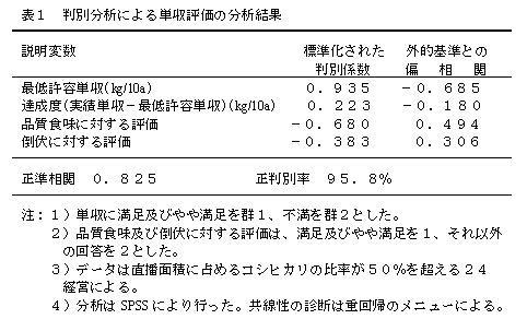 - 満足度評価(図1)をもとにデータを満足グループと不満グループに分け判別分析を行った。計測結果より正準相関は0.825で、95.8%のサンプルが正しく分類された(表1)。なお、実績単収は最も直接的なデータであるが、達成度(実績単収-最低許容単収)との間に相関(r=0.78)があるので最低許容単収を代わりに用いた。満足度に及ぼす影響度は、最低許容単収、品質食味に対する満足度、倒伏に対する満足度、達成度、の順である。