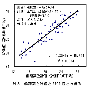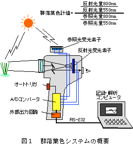 群落葉色計測システムは、2波長の反射率比から隔測で葉色を求める群落葉色計を短時間で自動計測・出力・記録・解析できるよう改良したシステムである。その測定値は、市販の接触式葉緑素計と高い相関があり、生育情報取得に有効である。
