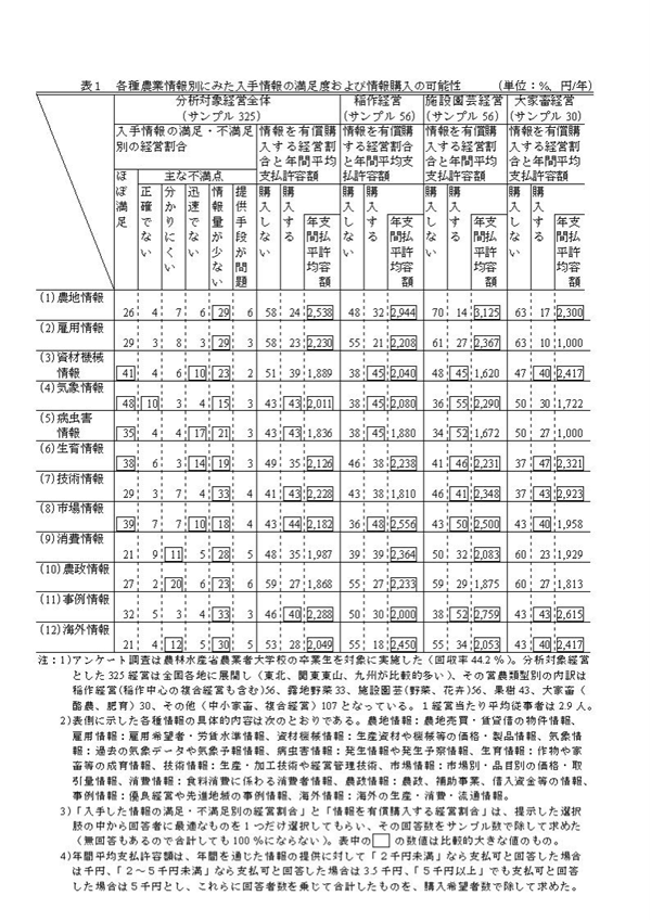 農業経営の外部から得られる農業情報を、(1)農地情報、(2)雇用情報、(3)資材機械情報、(4)気象情報、(5)病虫害情報、(6)生育情報、(7)技術情報、(8)市場情報、(9)消費情報、(10)農政情報、(11)事例情報、(12)海外情報に大別し、それぞれについて農業者が感じている情報収集上の問題点及び有償購入の可能性を整理すると次のようになる(表1)。