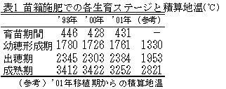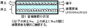 - 苗箱施肥法は育苗床土に、本田で稲体が必要とする窒素成分を通常被覆尿素で与える。ここでの技術は、LPSS100の他LPS120を1:2で混合し(区名:苗箱混合)、これを床土に層状に施用し、播種後慣行と同様に育苗し移植する方法であり、慣行栽培の穂肥に相当する窒素成分のみ育苗箱に施用する方法である(図1)。