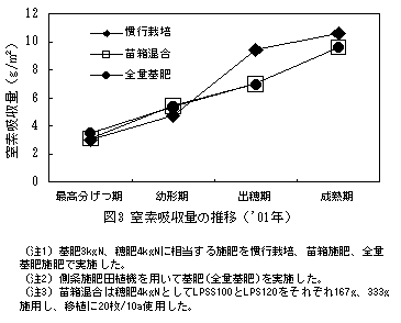 - 生育時期ごとの窒素吸収量は、苗箱混合が全量基肥と極めてよく一致する。(図3)