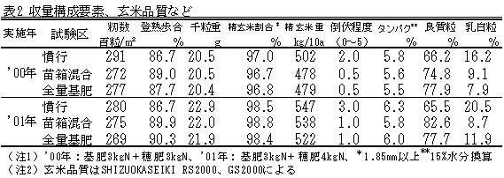 - 苗箱混合は、収量では慣行より若干劣るものの倒伏程度は小さく、玄米のタンパク含有率や乳白粒割合が低くなり品質が向上する。これらは全量基肥施肥法と同様である(表2)。