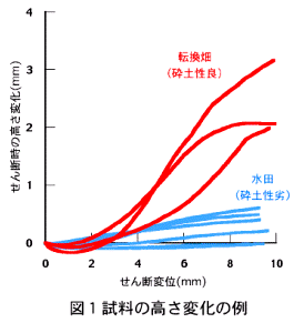 直接一面せん断試験機を用い、せん断破壊時の土壌の間隙量の変化を測定することにより、高水分域の脆性が低い粘土質土壌の砕土性を評価できる。この方法によれば室内の一定条件において土壌の砕土特性が整理可能である。