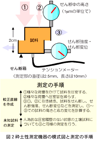 - 直径6cmの土質試験用のコアで10~15点の土壌をサンプリングする。次に小型テンションメータを試料に挿入できるように改造した一面せん断試験機を用いて、図2の手順に従い、せん断時の高さ変化と測定中の応力を求める。