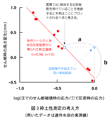 - 人為的な圧密を加えない圃場状態の土壌試料はこの直線からはずれるが、これは過去に圃場で受けた圧密履歴(図3のa)を考慮していないためであるそこで、縦軸方向における較正直線との距離(図3のb)を基準点からの土壌の高さ変化とし、これを砕土性の指標とする。