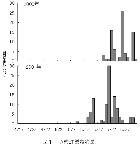- 予察灯(60W白熱灯)による初誘殺は、2000年5月19日、2001年5月9日に認められた(図1)。