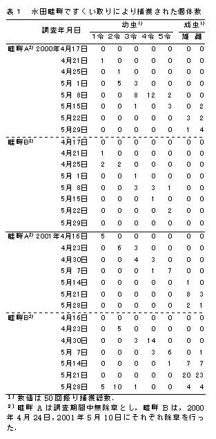 - 水田畦畔におけるすくい取り調査では、2000年4月21日、2001年4月16日に1齢幼虫の生息が初めて確認された。両年次とも初確認以降、調査毎に幼虫齢期の進行が認められ、成虫は2000年5月15日、2001年5月7日に最初に確認された(表1)。
