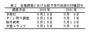 - 予察灯による成虫の初誘殺時期は、他の3つの方法による調査結果ときわめてよく一致し、また、春期の気温の違いに起因すると考えられる成虫の発生時期の年次間差を正確に反映している(表2)。