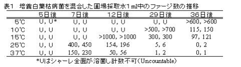 - ファージ法では、PCRでの検出が認められなくなるとともにファージ数の減少が確認されるが、その程度は低温であるほど緩慢であり、細菌数とファージ数の減少には時間差が大きくなることから(表1)、菌濃度を誤認する可能性がある。これは低温区ではファージ自体の安定性が高く、寄主細胞である白葉枯病菌がなくとも活性が低下しにくいためと考えられる。