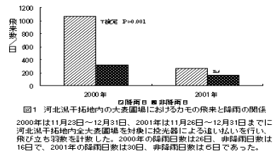 河北潟干拓地は石川県の中央部に位置する県内最大の畑作地帯で大麦、飼料作物、レンコンなどでカモ類の食害によると思われる被害が発生している。1999年度は大麦作付け面積約340haのうち134haが食害を受け深刻な事態となった。しかし、麦類を食害するカモ類の知見は少なく、葉を好むヒドリガモが知られているだけである。そこで、麦類食害カモ種と圃場侵入条件を究明し、鳥害対策上必要な知見を得る。