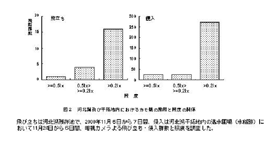 マガモ、コガモ及びカルガモによる大麦の加害が明らかとななった。降雨、降雪等によって形成される圃場の水たまりが、これらカモ類にとって麦圃場侵入に好適な条件と考えられる。また、圃場侵入ピーク時の照度は、0.2lx未満である。