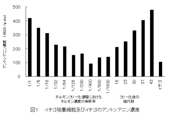 イチゴ(品種:女峰)の継代培養細胞系から、選抜及びホルモンフリー化により赤色のアントシアニン生産培養系を確立した。増殖と色素生産に合成植物ホルモンを使用せずにイチゴのアントシアニンを効率的に生産できる。