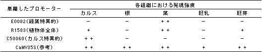 表 単離した3種類のプロモーターのイネにおける発現部位