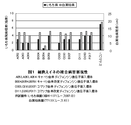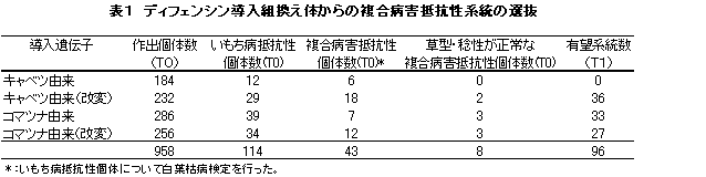 | 発表論文等 | :1)川田ら(2001)複合病害抵抗性を示す形質転換植物、特願2001-283117. 2)川田ら(2001)育雑 3(別1): p258. 3)川田ら(2001)育雑 3(別2): p95. |