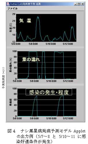 ナシ黒星病発病予測モデルは、温度と濡れ時間の気象データから、病原菌の感染時期を推定し、発病程度を高い精度で予測できる。モデルの計算はインターネットに接続されたコンピュータから誰でも実行可能である。 |
