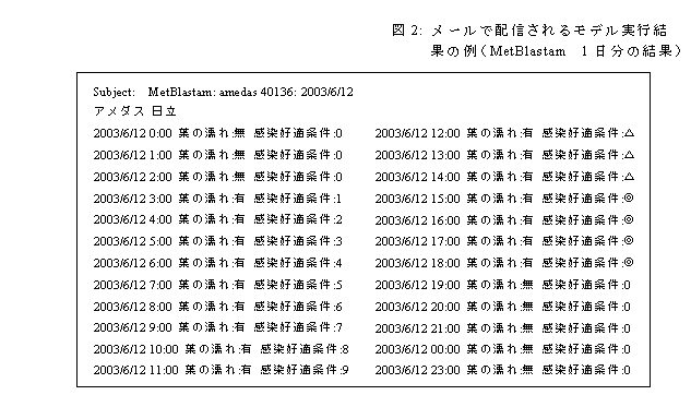 作物生育予測モデル、病害虫発生予察モデル等各種のソフトを定期的に自動実行し、結果などの情報を事前登録されたユーザにメールで配信するシステムである。ユーザはモデルの結果を栽培管理、病害虫管理に効果的に反映させることができる。 |