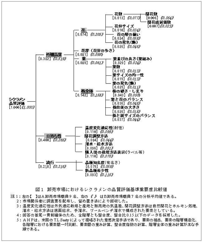 AHPの計算法を用い、鉢物取引の多い異なる地域の卸売市場間でのシクラメンの品質評価差異を分析した。中京の市場では外観品質の重要度が0.519と高い。一方、関西の市場は外観品質が0.382に対し、日持ち性が0.400の重要度を示した。これは生産者等による市場の評判と等しい。 |