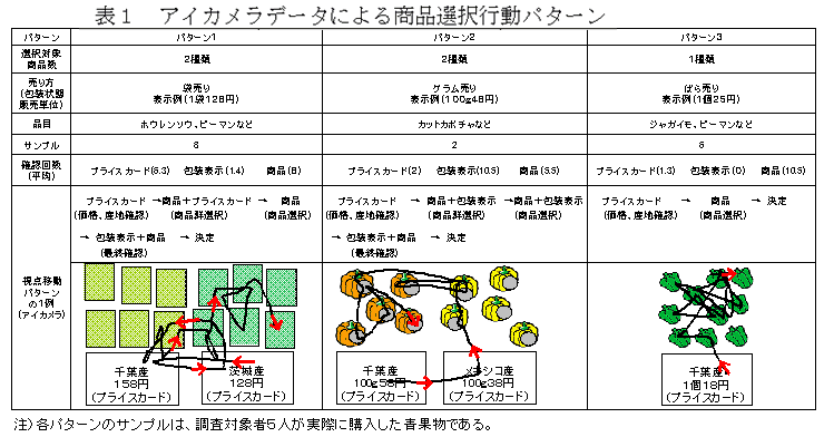 生産履歴情報を含む青果物の情報を消費者に提供する際には、購入時に消費者が必要とする食品情報を的確に把握しておく必要がある。そこで、消費者がスーパーで実際に青果物を購入した時の発話(プロトコル)、店内移動(動線)、視点の動き(アイカメラ)を用いて店舗内における青果物購買行動の特徴とそこでの食品情報処理パターンを明らかにした。なお、調査対象者は、対象店舗にて日頃買い物をしている30代~50代の女性である。 |