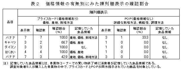 青果物購買行動は、品目選択行動と1品目内での商品選択行動から構成されており、そこでは、いくつかの食品情報を参考にしている。また、商品の売り方(包装状態、販売単位)によって商品選択行動の際に参考にする表示情報の種類と回数が異なっているものの、商品選択行動の最初に陳列棚表示を確認する行動と、表示だけでなく商品そのものを確認することは共通している。 |