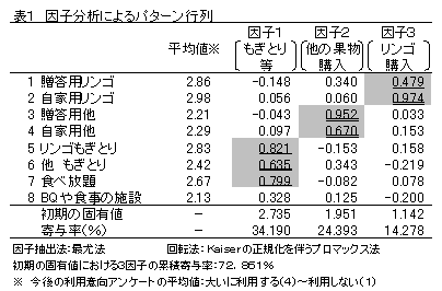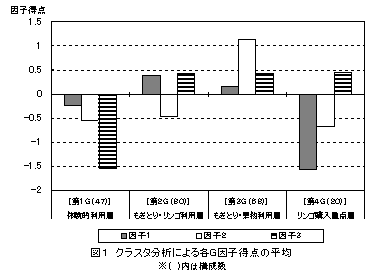 リンゴ中心の観光果樹園利用者をもぎとり等を主目的とする「体験的利用層」、もぎとりとリンゴ購入目的の「もぎとり・リンゴ利用層」、もぎとりとリンゴ・他の果物購入を目的とする「もぎとり・果物利用層」、リンゴ購入を目的とする「リンゴ購入重点層」の4グループに分類した。 |