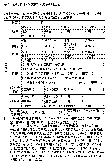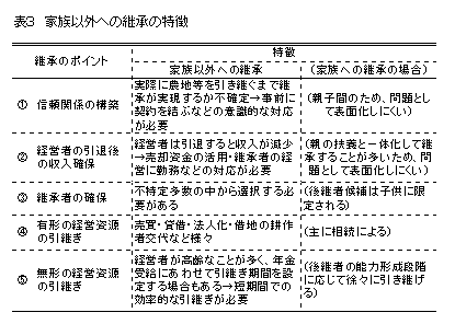 農業後継者がいない家族経営の事業を家族以外の者が引き継ぐという新しい継承方式が、様々な地域・経営部門において出現している。このような新たな継承が成立するためには、事前の契約による信頼関係の構築や引退する経営者の収入確保などの対応を実施することがポイントとなる。 |