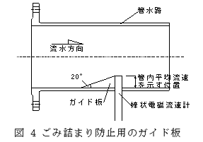 棒状電磁流速計を管水路側壁部から管内へ横方向に挿入して、センサの直上流側にセンサ径より薄い直角三角形状のガイド板を設置し、実測流速、流速補正係数、管水路断面積との演算によって、ごみ詰まりのない高精度な管水路流量計を開発した。 |